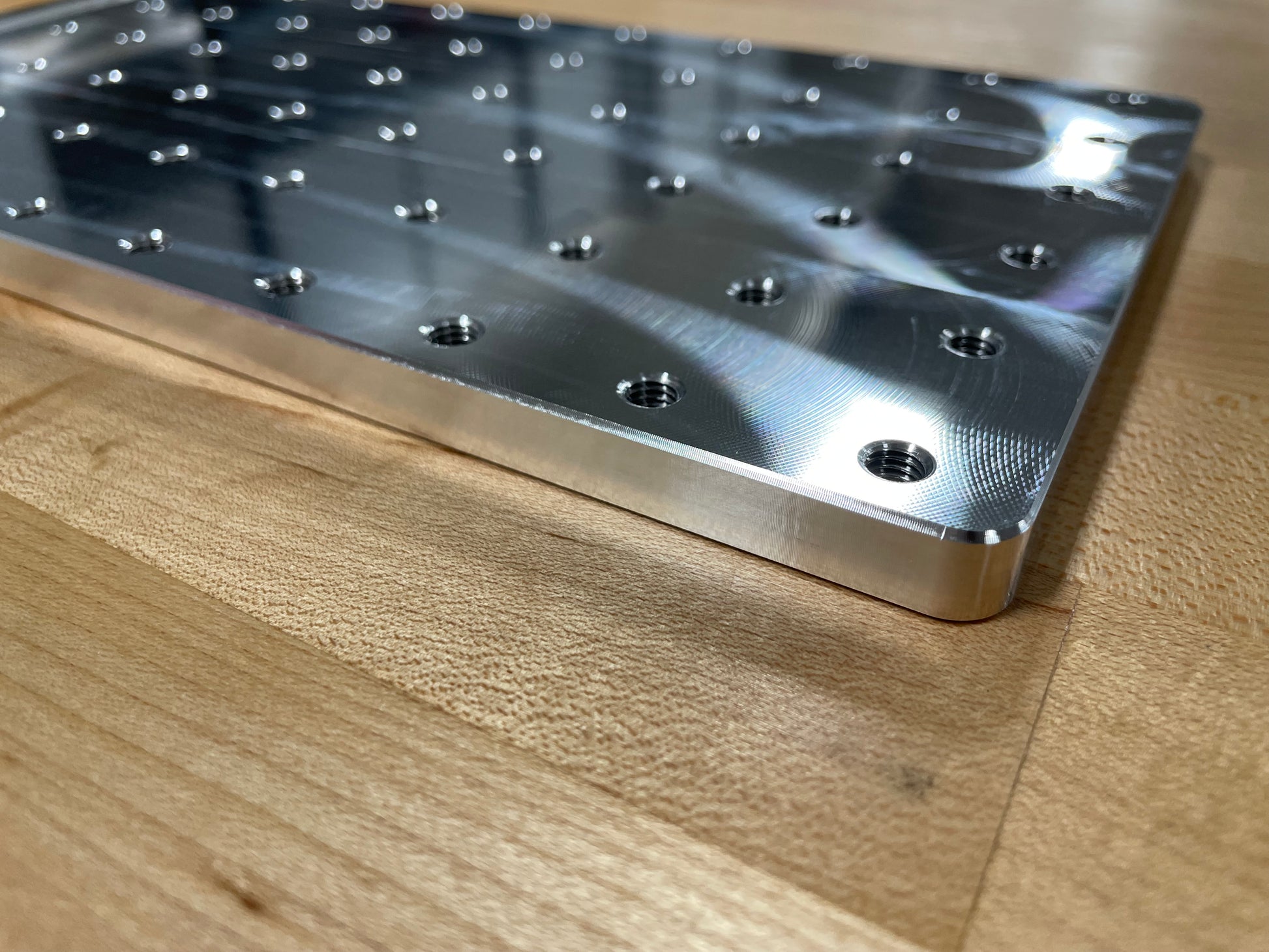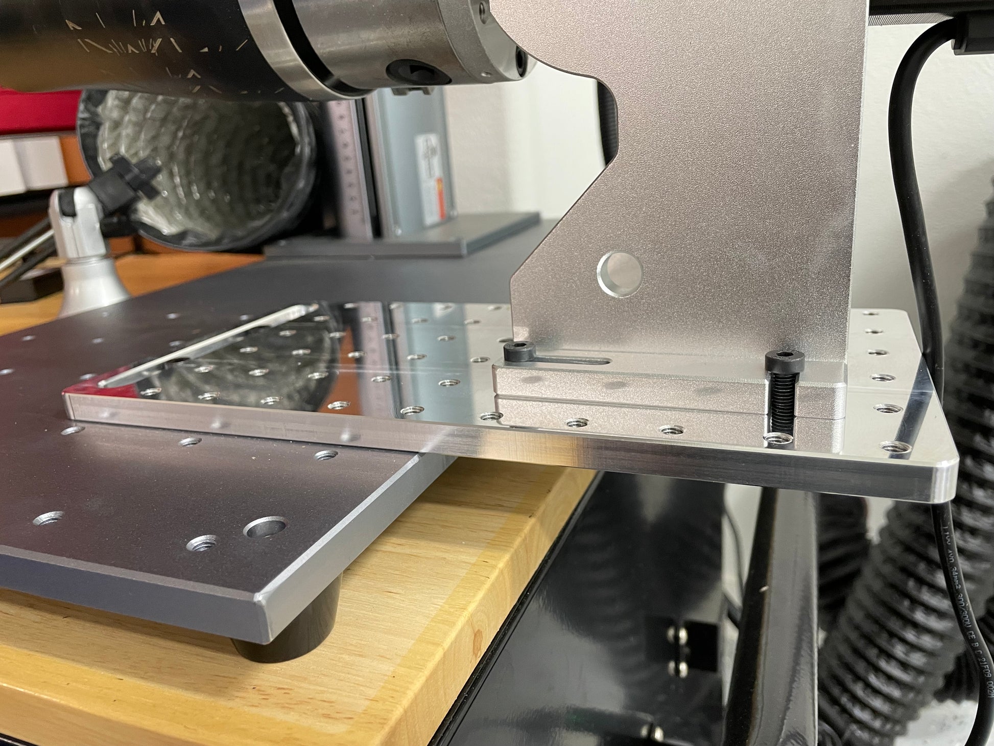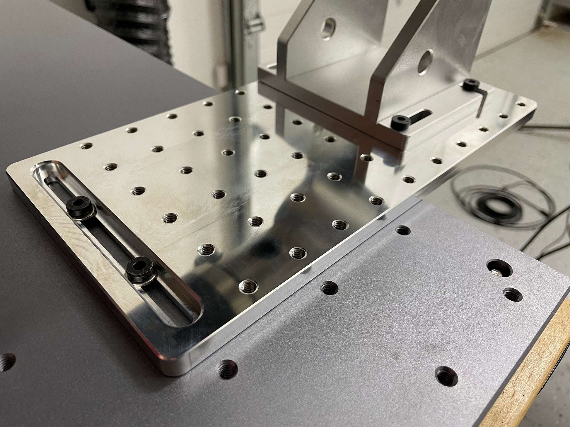 The plate is made out of 10mm thick 6061 aluminum, ensuring it can handle the weight of the rotary and the item being engraved. It has M6 holes on a 25mm grid, 125mm wide by 225mm long.